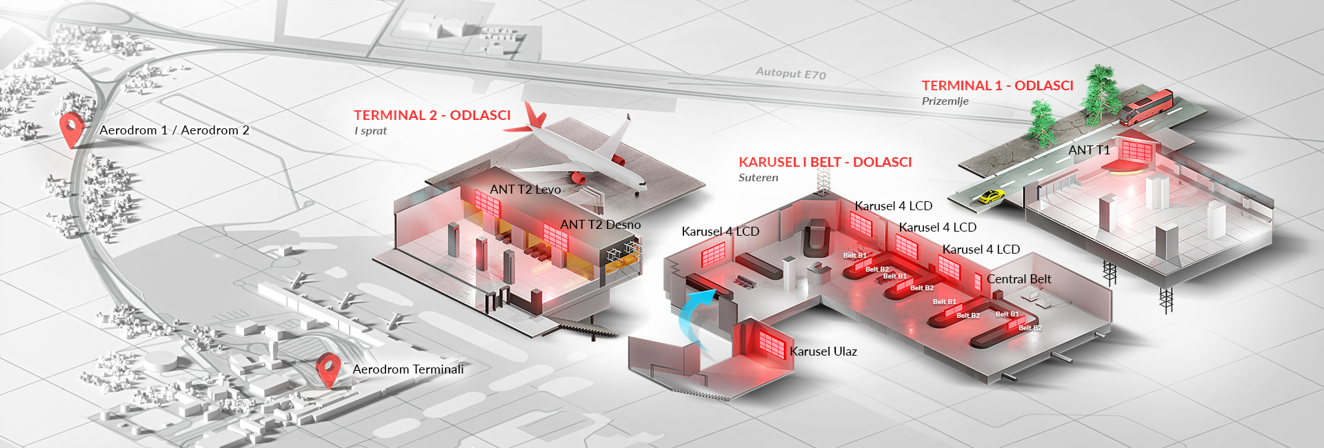 The four positions above the luggage belt are called the Karusel. They are placed in one line, in the area of the aerodrome, where passengers really have time to look around and take their first impressions.